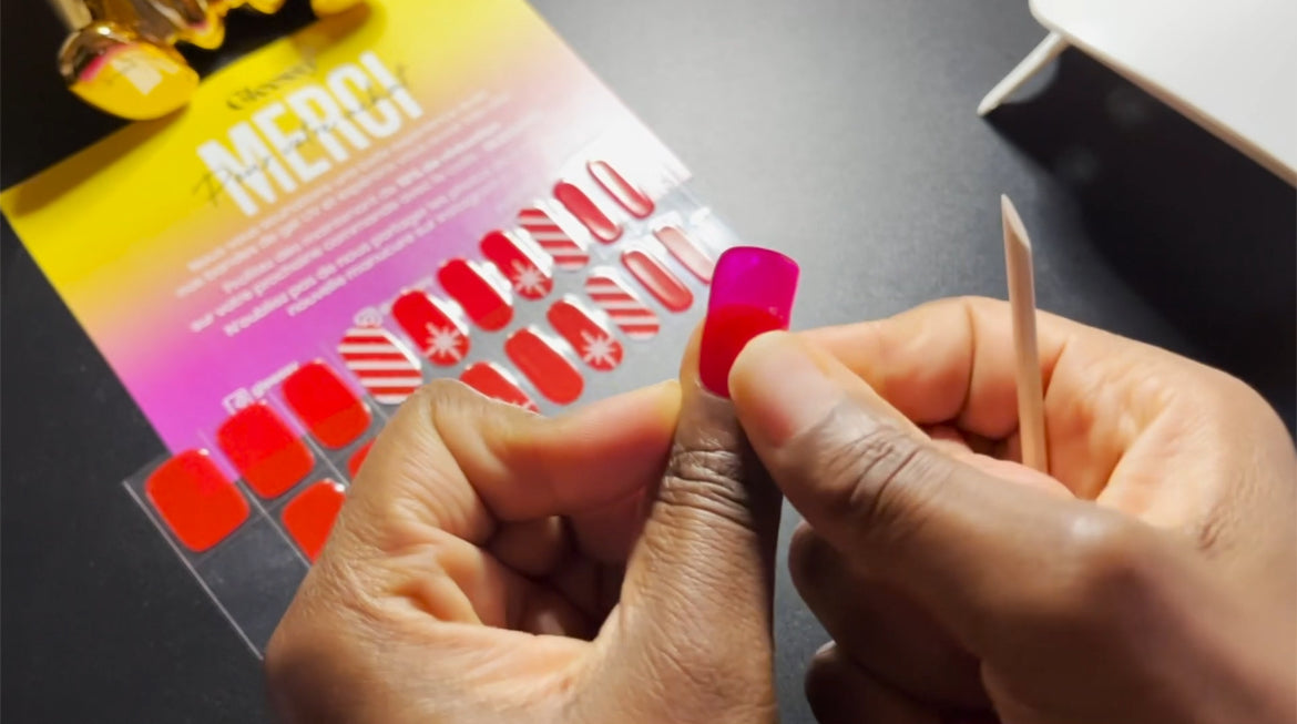 * Roulez le bâtonnet à cuticules sur les côtés de la bande pour l'aplatir contre l'ongle.
