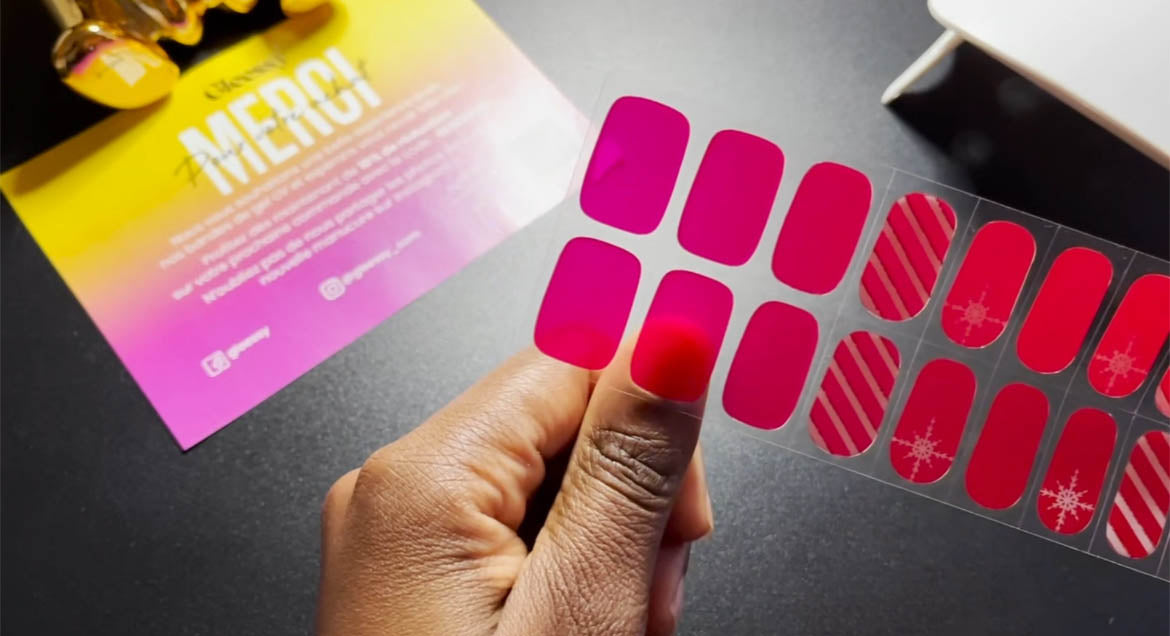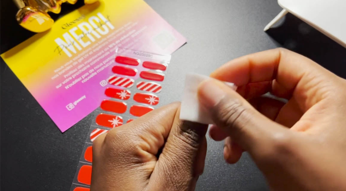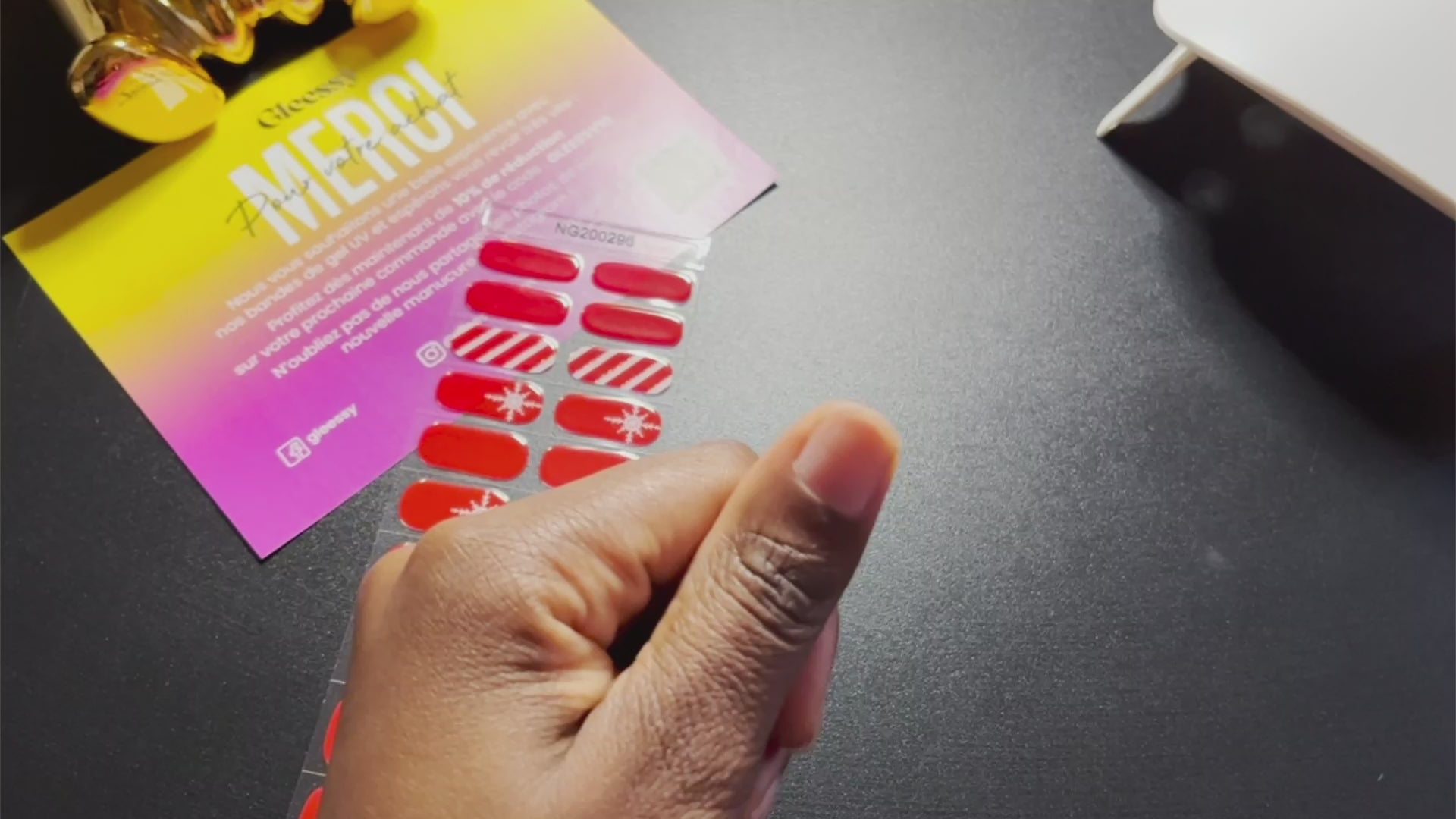 * Appliquez fermement la bande de vernis gel sur votre ongle, en veillant à ne pas la poser sur vos cuticules pour une tenue optimale.